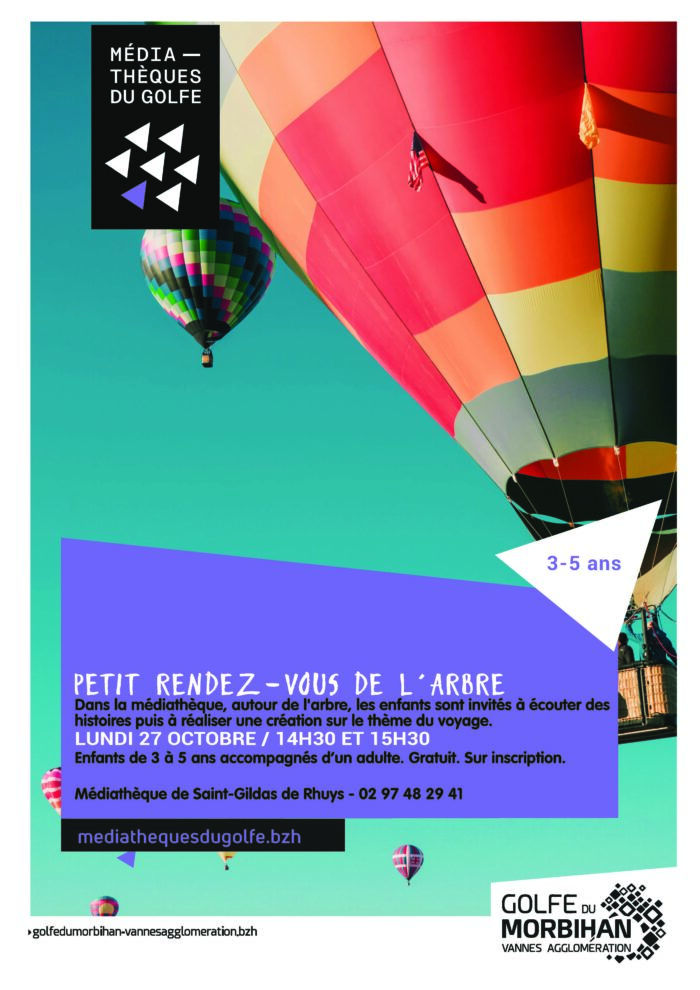 LUNDI 27 OCTOBRE / 14H30 ET 15H30 – Dans la médiathèque, autour de l’arbre, les enfants sont invités à écouter des histoires puis à réaliser une création sur le thème du voyage. Enfants de 3 à 5 ans accompagnés d’un adulte. Gratuit. Sur inscription.