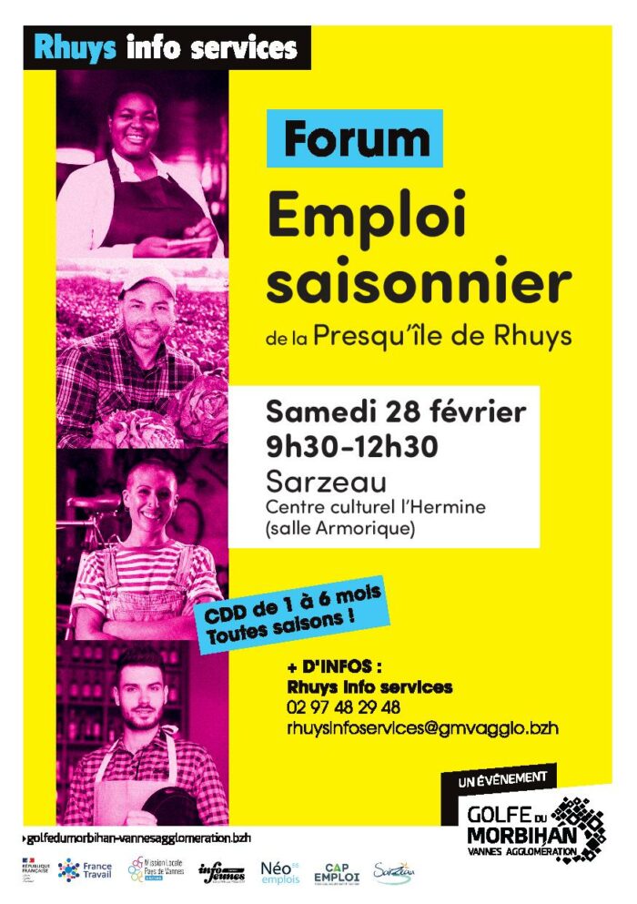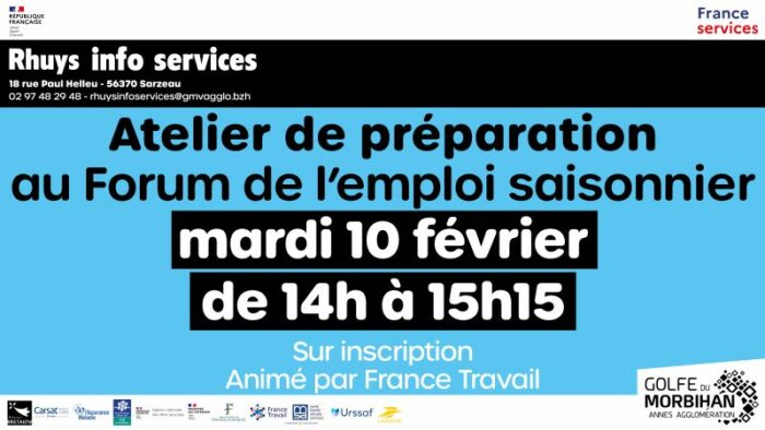 ► Cette année, France travail animera au sein de Rhuys info services un atelier de préparation au forum saisonnier pour les candidats le 10 février de 14h à 15h15. Lien pour l’inscription sur le site de France travail.
