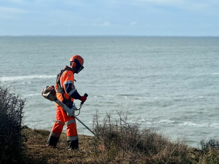 L’entreprise DERVENN, mandatée par la commune, réalise une fauche de la végétation pour restaurer les habitats favorables à l’aster d’Armorique, et renouvelle les dispositifs de canalisation du public pour préserver la plante du piétinement. Elle en profite également pour débarrasser cette portion du littoral de ses 75 pieds d’une espèce exotique envahissante présente sur nos côtes : le baccharis. Ces actions de préservation ont été définies et programmées en collaboration avec le Parc naturel régional du Golfe du Morbihan. Elles prendront fin en mars.